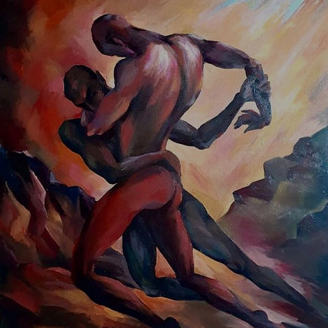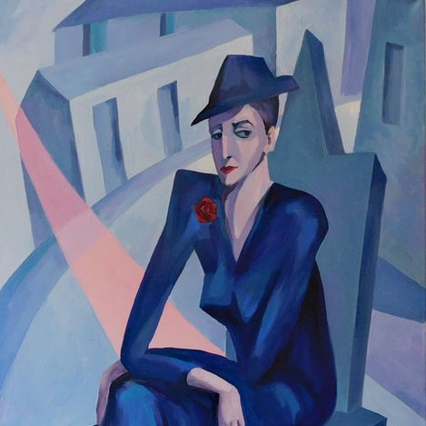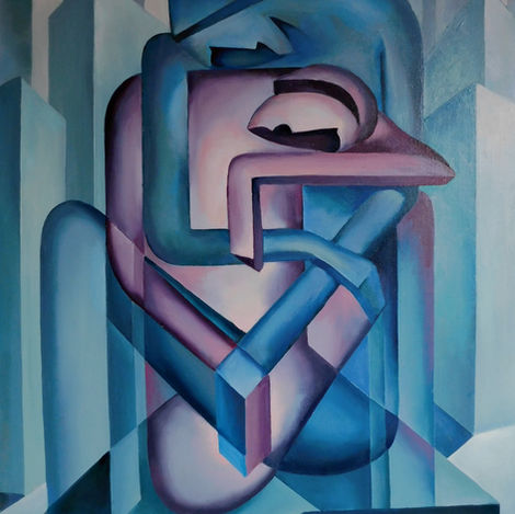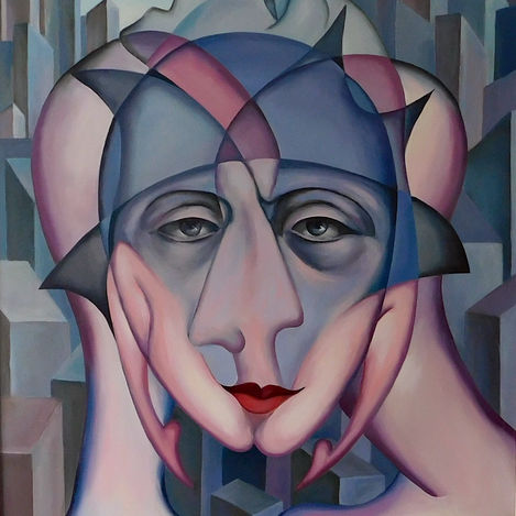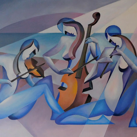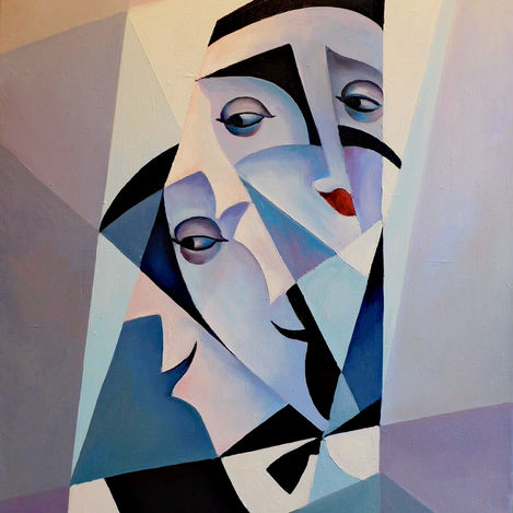 "The cubism of Pablo Picasso and the overlapping imagery found in the surrealism of Marc Chagall merge in Valery Vinokurov’s thought-provoking artwork. Although figurative, Vinokurov’s paintings are creative explorations of shape. He dissects shapes into more shapes, playing with the way we perceive objects. Groups of people are the predominate subject matter of Vinokurov’s paintings. Oftentimes, these people are trios of women. Whether appearing as sisters, nudes, or musicians they exude a peaceful yet strong presence. The cubist element to the paintings suggests the multifaceted aspect of womanhood, while the fact that three women interlock indicates a divine trinity. Although Vinokurov gives special attention to the feminine mystique, he also paints men and non-gender-specific humans. Furthermore, music and the city are recurring themes in his work. Meditative cool colors wash Vinokurov’s canvas. Soft blues, shy purples, dusty pinks, and brooding grays make the paintings serene and pensive. When Vinokurov works in bright colors, he punches up his moody pastels with heavy doses of red."